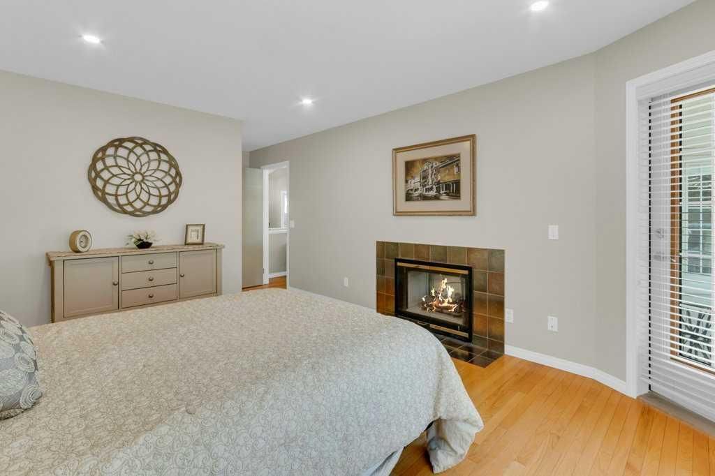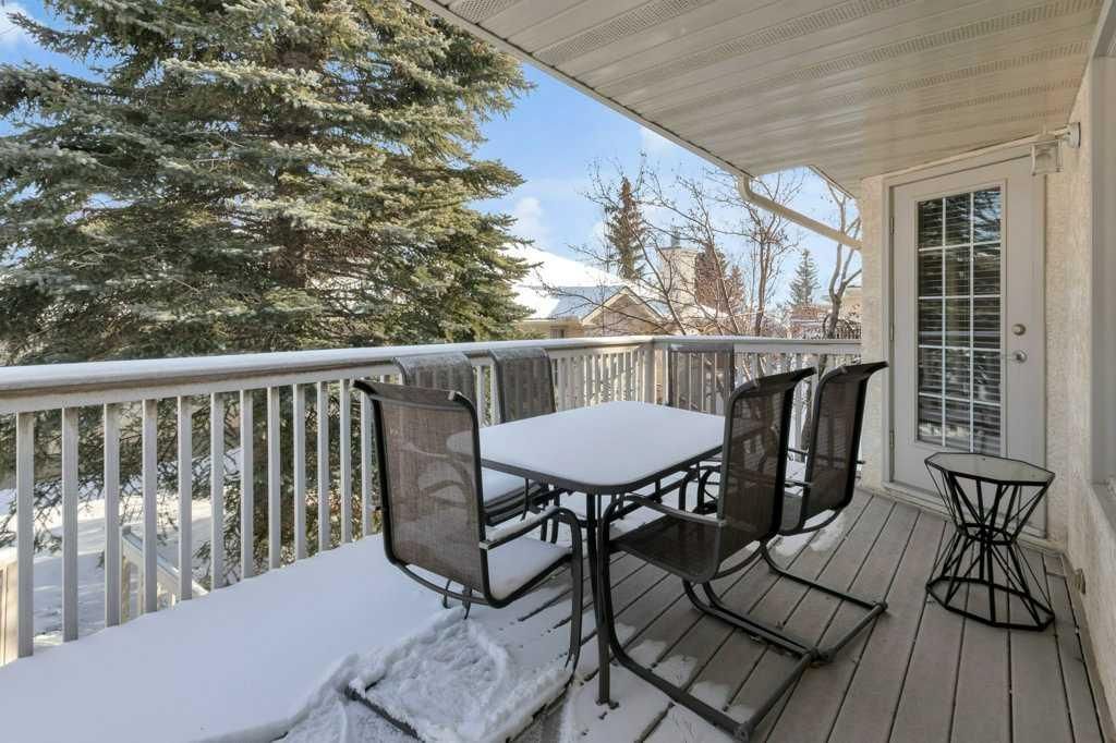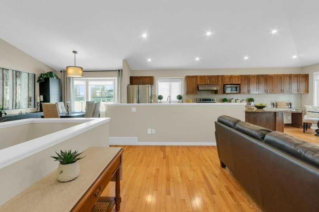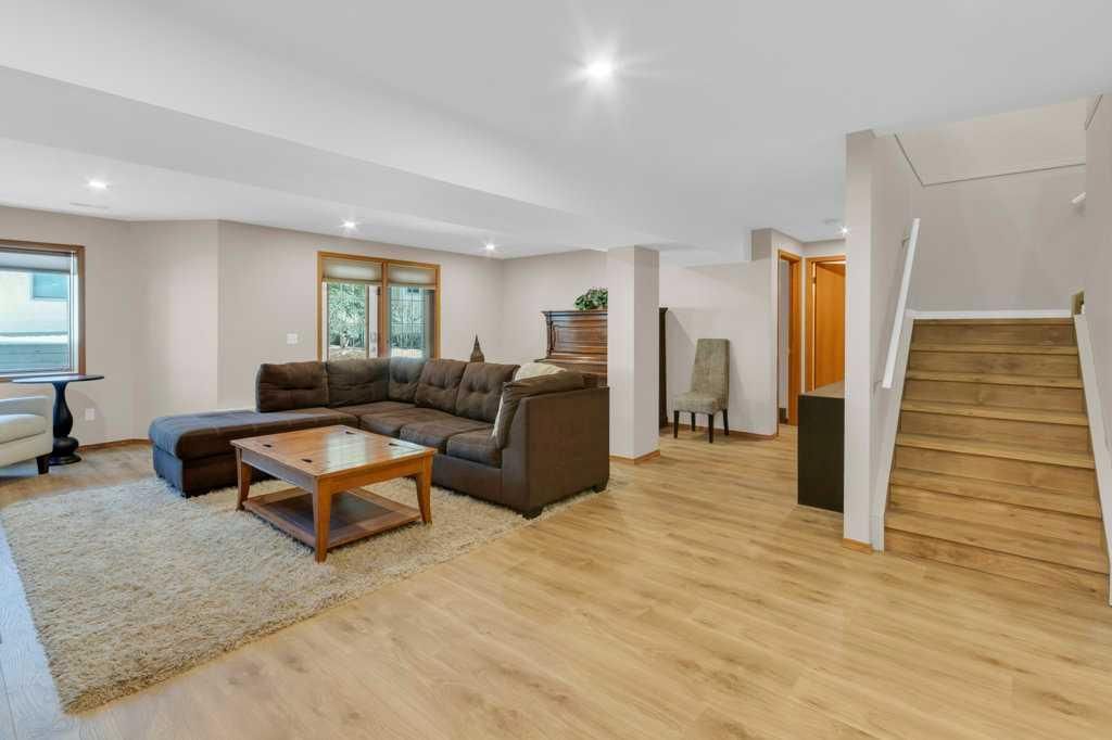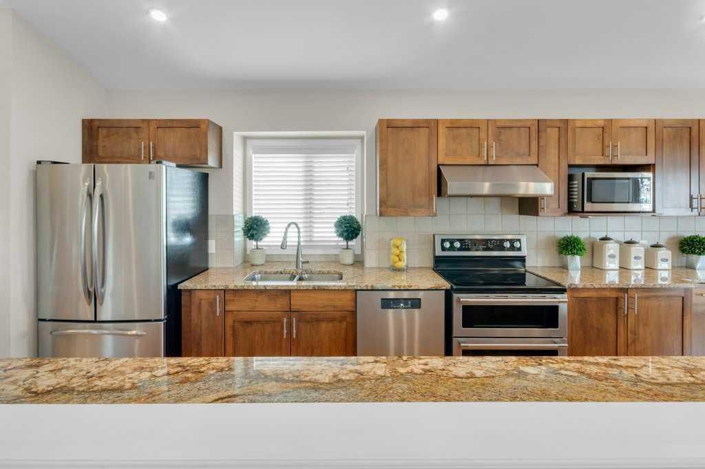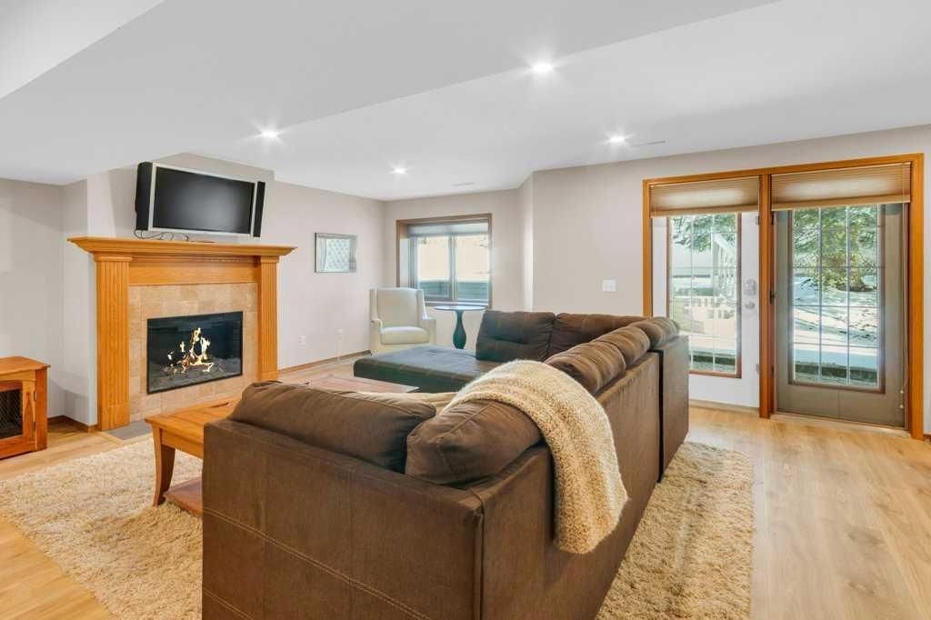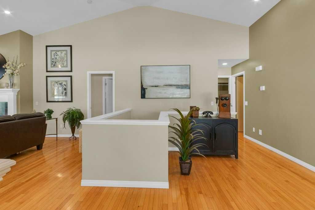 Welcome to this exceptional luxury walkout villa with an attached double garage, perfectly positioned on a premium corner lot within a beautifully maintained and highly sought-after complex. Thoughtfully designed and extensively upgraded, this home offers an ideal blend of elegance, comfort, and low-maintenance living. The open-concept main floor is highlighted by rich hardwood flooring and soaring vaulted ceilings, creating an inviting space ideal for both everyday living and entertaining. The chef’s kitchen is the heart of the home, featuring a striking 16-foot granite island and abundant cabinetry, seamlessly flowing to the deck with a gas line for barbecuing. A formal dining room and separate nook provide flexible gathering spaces, while the living room showcases a stunning double-sided fireplace shared with the spacious main-floor primary suite. The primary retreat includes a walk-in closet and a luxurious five-piece ensuite. A den/home office, powder room, main-floor laundry, and quality Hunter Douglas blinds to complete the level. The lower level walkout expands the living space with a large family room featuring an electric fireplace, offering a warm and versatile area ideal for relaxing, entertaining, or incorporating a home office. This level also offers a generous bedroom, a four-piece bathroom, an impressive full-width storage room, and direct access to a private patio, perfect for quiet mornings or relaxed evenings outdoors. Additional highlights include central air conditioning, a high-efficiency furnace, poly-B plumbing fully replaced, Luxury Vinyl Plank in lower level, flat painted ceilings, and numerous LED pot lights for a modern, polished finish. Beyond the home, residents enjoy a warm and welcoming community with optional summer gatherings at the central gazebo and an annual Stampede barbecue, creating relaxed opportunities to connect and build lasting friendships. Conveniently located close to shopping, transit, and Stoney Trail, this beautifully upgraded villa offers an exceptional lifestyle in a truly special setting. A rare opportunity to enjoy luxury villa living in a friendly, community-focused environment.